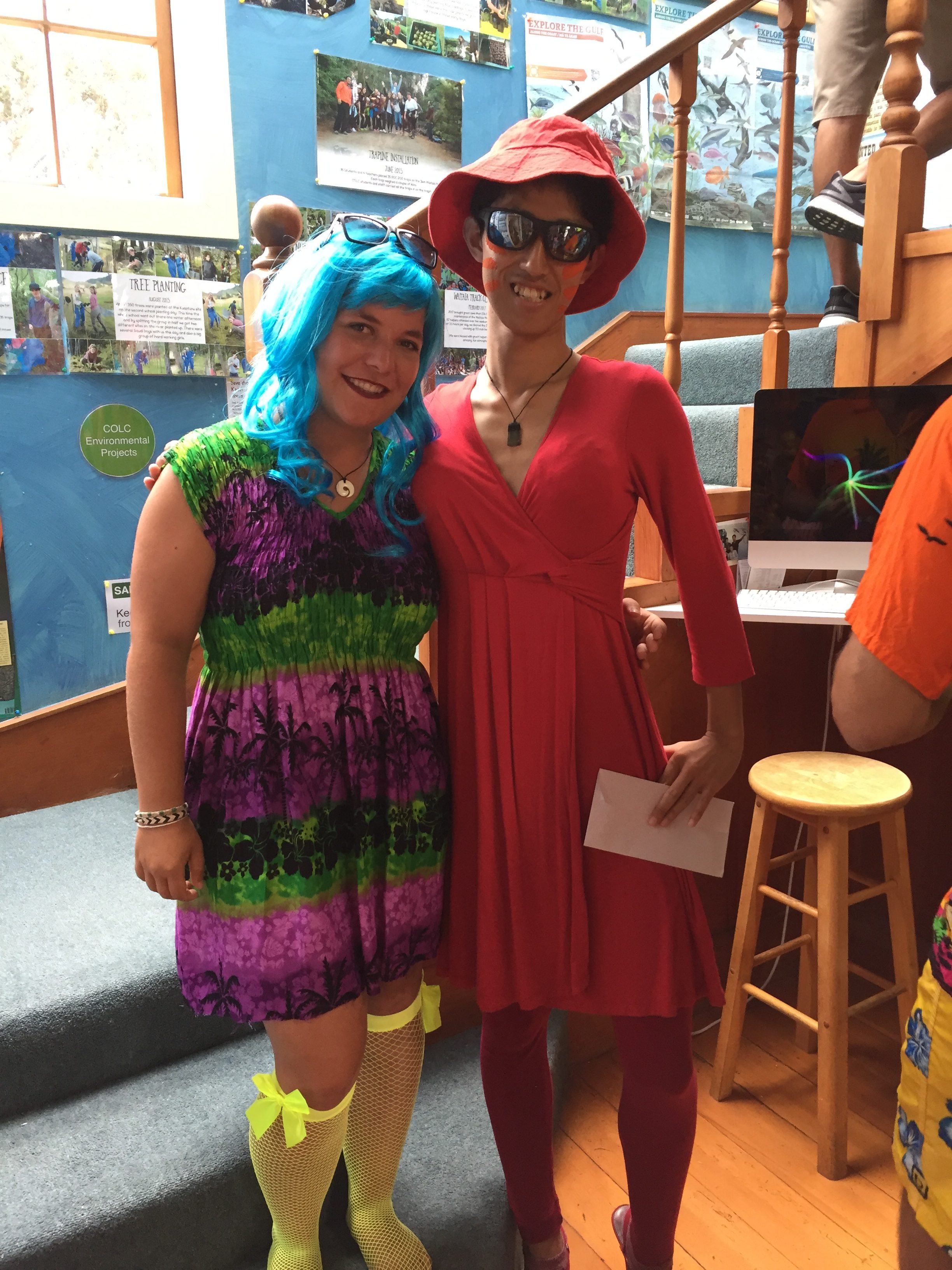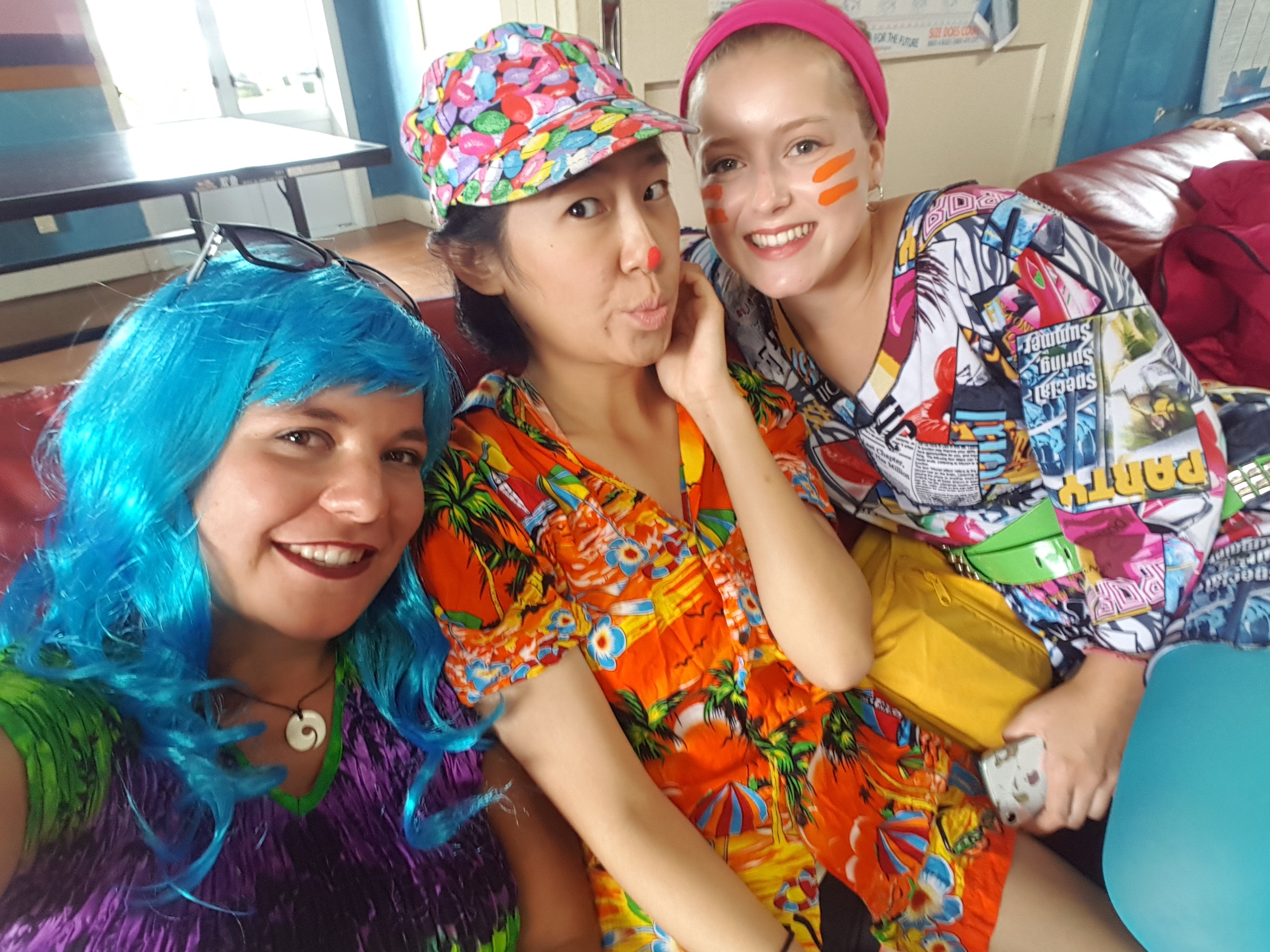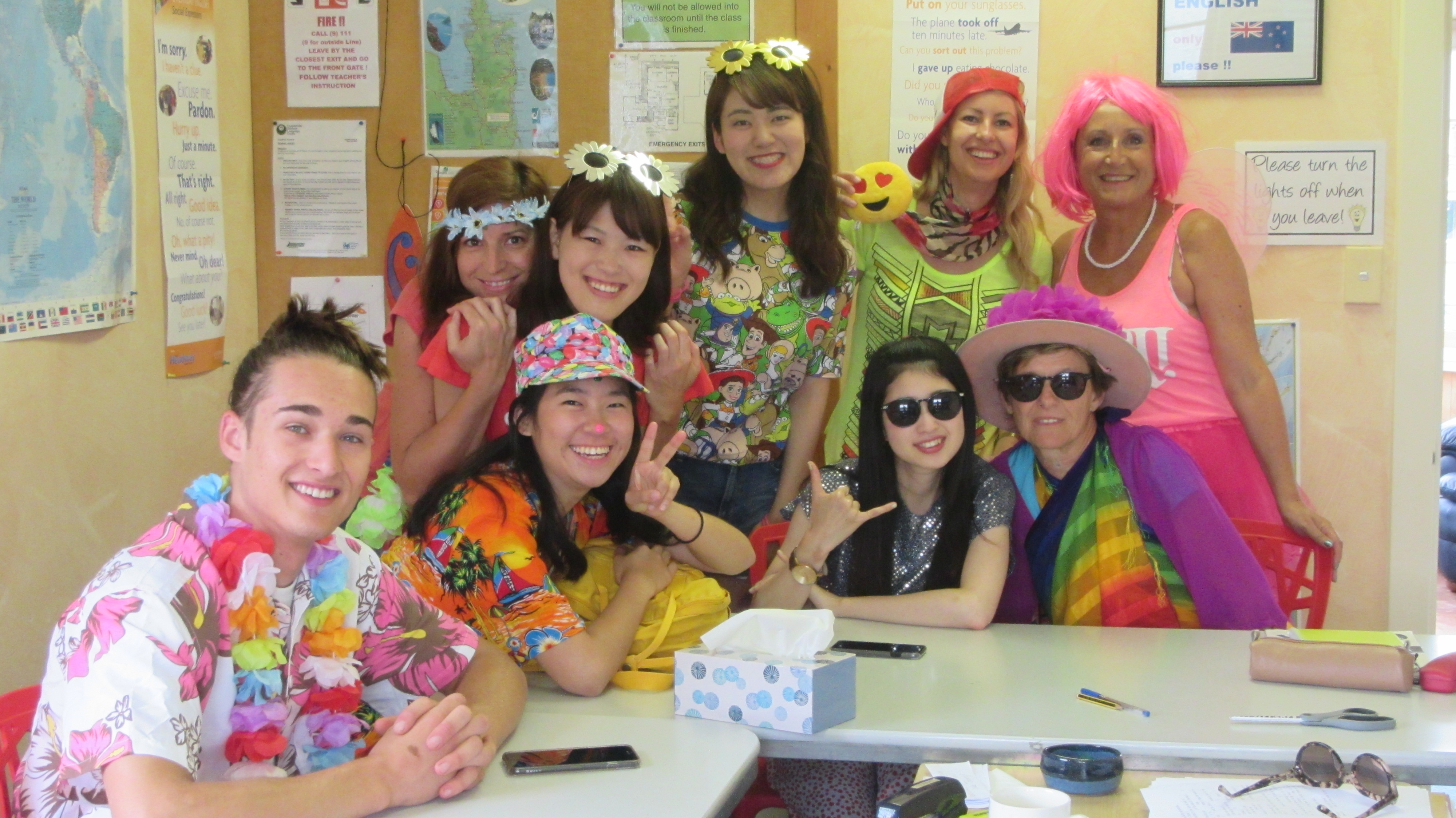 Der Freitag war jedoch nicht nur ein trauriger Tag, es war nämlich auch gleichzeitig mit meinem letzten Tag am COLC auch ein „Loud Shirt Day“ angesagt. Am Morgen verkleidete ich mich also passend mit meinem Loud Shirt Day Outfit und ging zur Schule. Loud Shirt Days sind immer besonders lustige Tage, da sich jeder vom Schulleiter bis zum 70 Jahre alten japanischen Mitschüler in ein farbenprächtiges, crazy und oft bad-taste mässiges Outfit schmeissen und dann so im Unterricht sitzen. Um 11 Uhr gibts dann die Parade, bei der eine externe Jury die besten Kostüme auswählt und schlussendlich einen Gewinner verkünden. Am Loud Shirt Day sieht man am COLC einfach alles, Männer in Kleidern und Highheels, farbenfrohe Perücken und verrückte Brillen, Hüte und andere Accessoires.