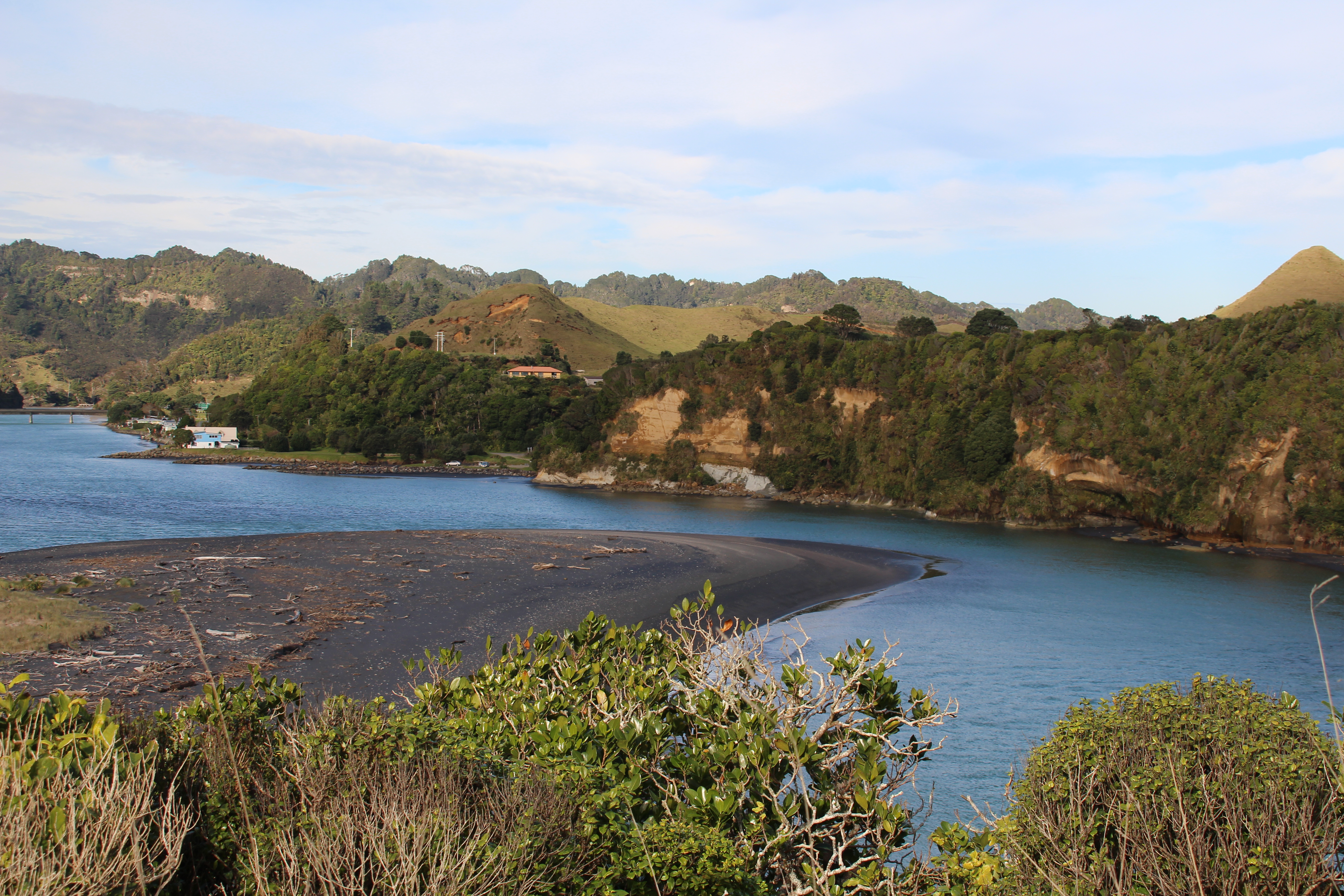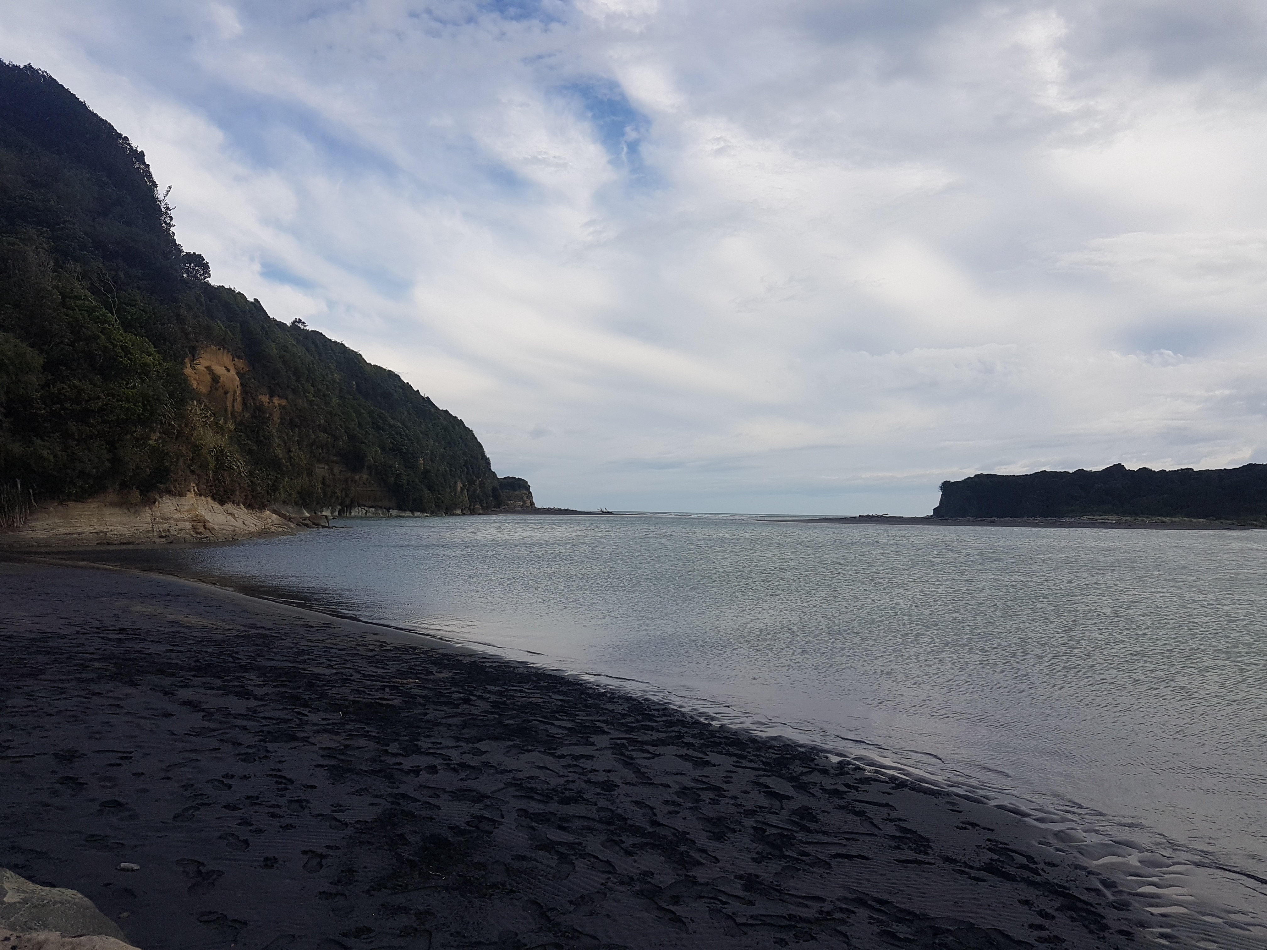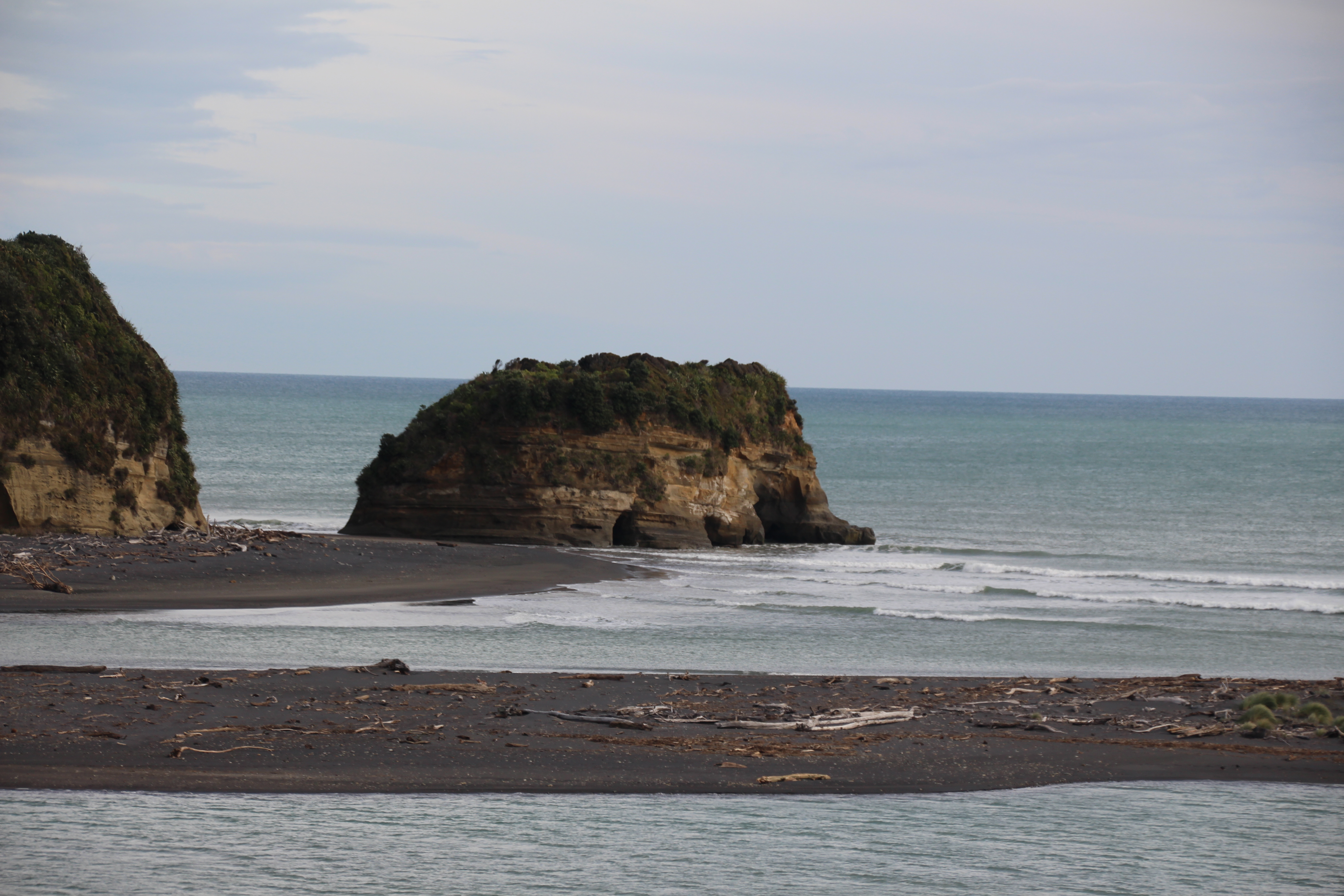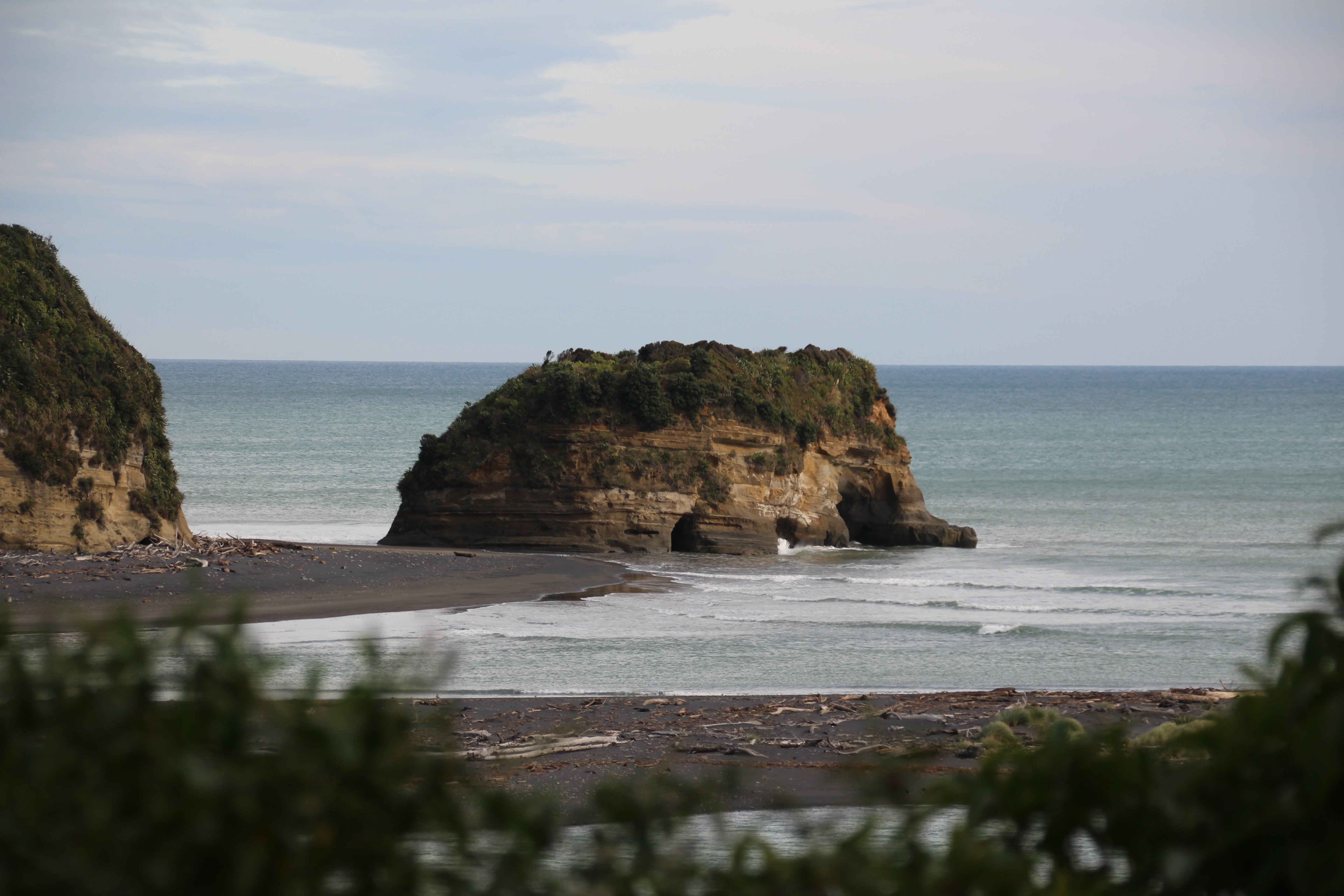 Da unser erster Plan so kläglich gescheitert war, wollten wir die berühmten Elephant Rocks ca. 1 Stunde nördlich von New Plymouth ansehen gehen. Wie wir nach etwas Recherche herausfanden, war ein Teil der Felsen, zwar vor kurzem eingestürzt und der Elefant sähe nun ein bisschen aus, wie auf den Rüssel gefallen, doch das schreckte uns nicht ab, und wir wollten den Elefanten trotzdem unbedingt sehen. Was wir bei unseren Recherchen leider nicht herausfanden (shame on us) war, dass man nur bei Ebbe zu den Elephant Rocks hinkonnte und wie es das Glück so wollte, war gerade Flut, als wir beim Parkplatz in der Nähe der Rocks ankamen… Ebbe würde erst am Abend wieder eintreten und von unserem Standort aus, konnte man die Rocks einfach partout nicht sehen. Etwas traurig fuhren wir weiter. Doch plötzlich ruft Sandra vom Beifahrersitz „Ich sehe den Elefanten!“, und tatsächlich. Es war zwar nicht DER Elefant, aber der Felsen, den wir von der Strasse aus sehen konnten, sah mit ein bisschen Fantasie trotzdem aus wie ein Elefant.