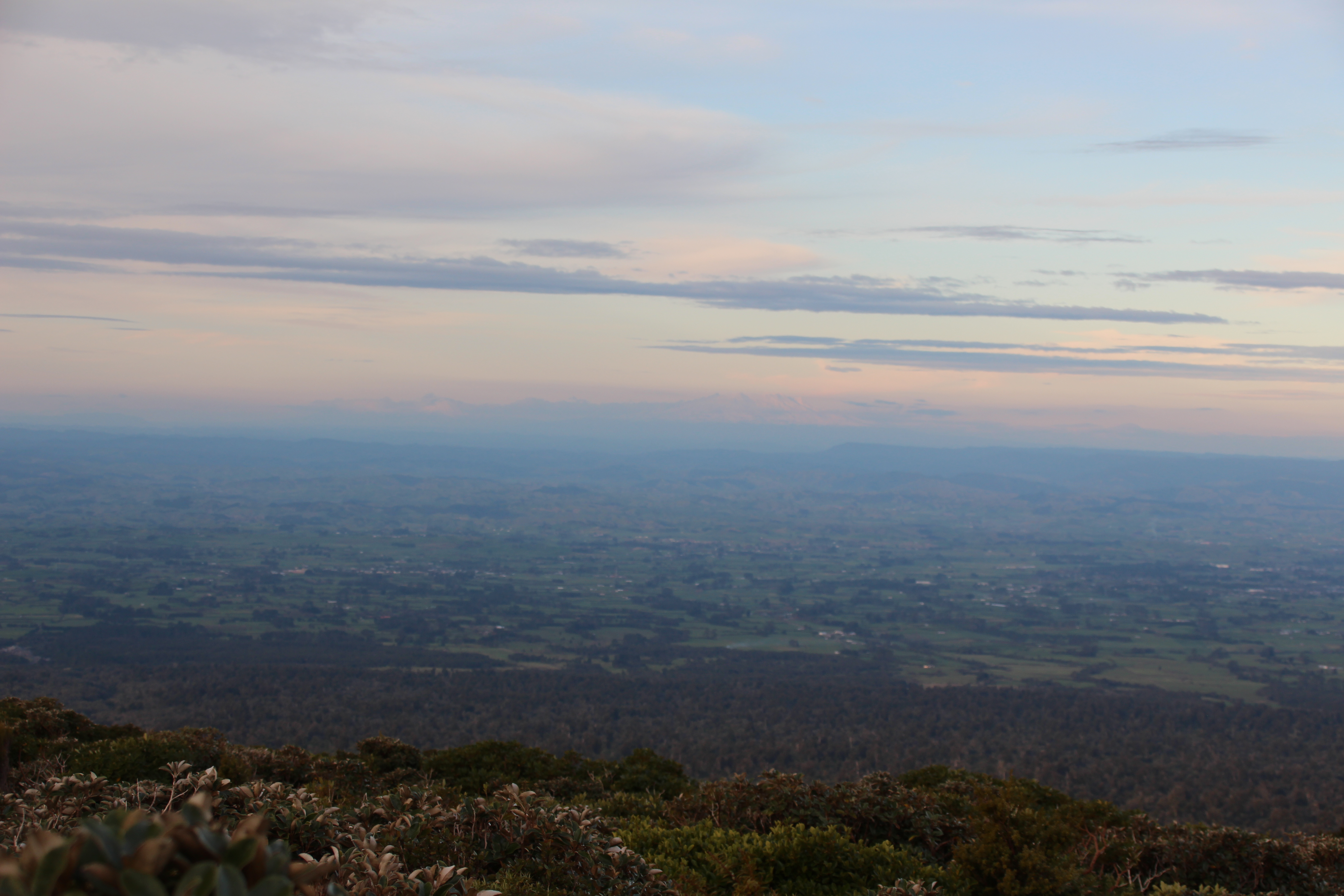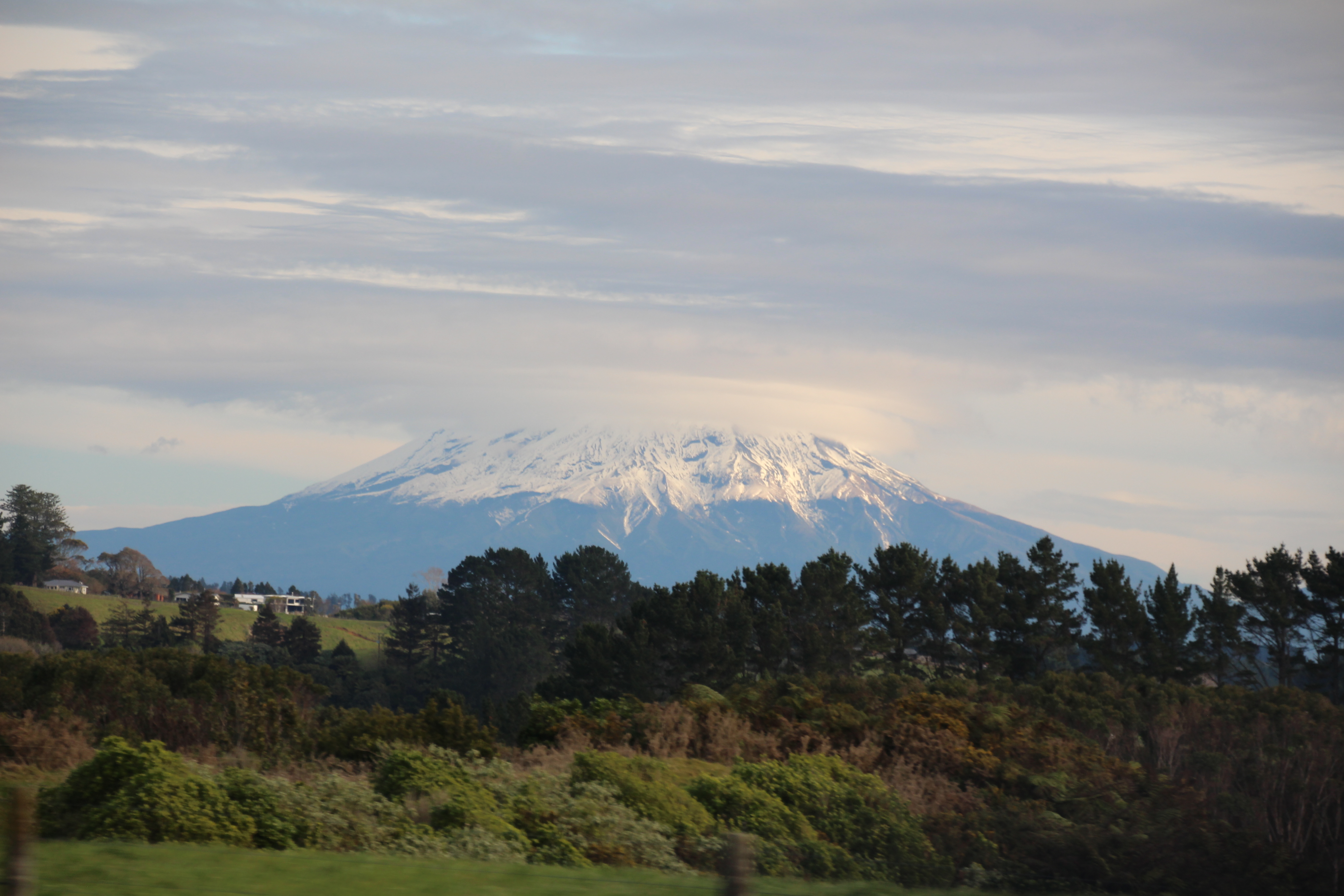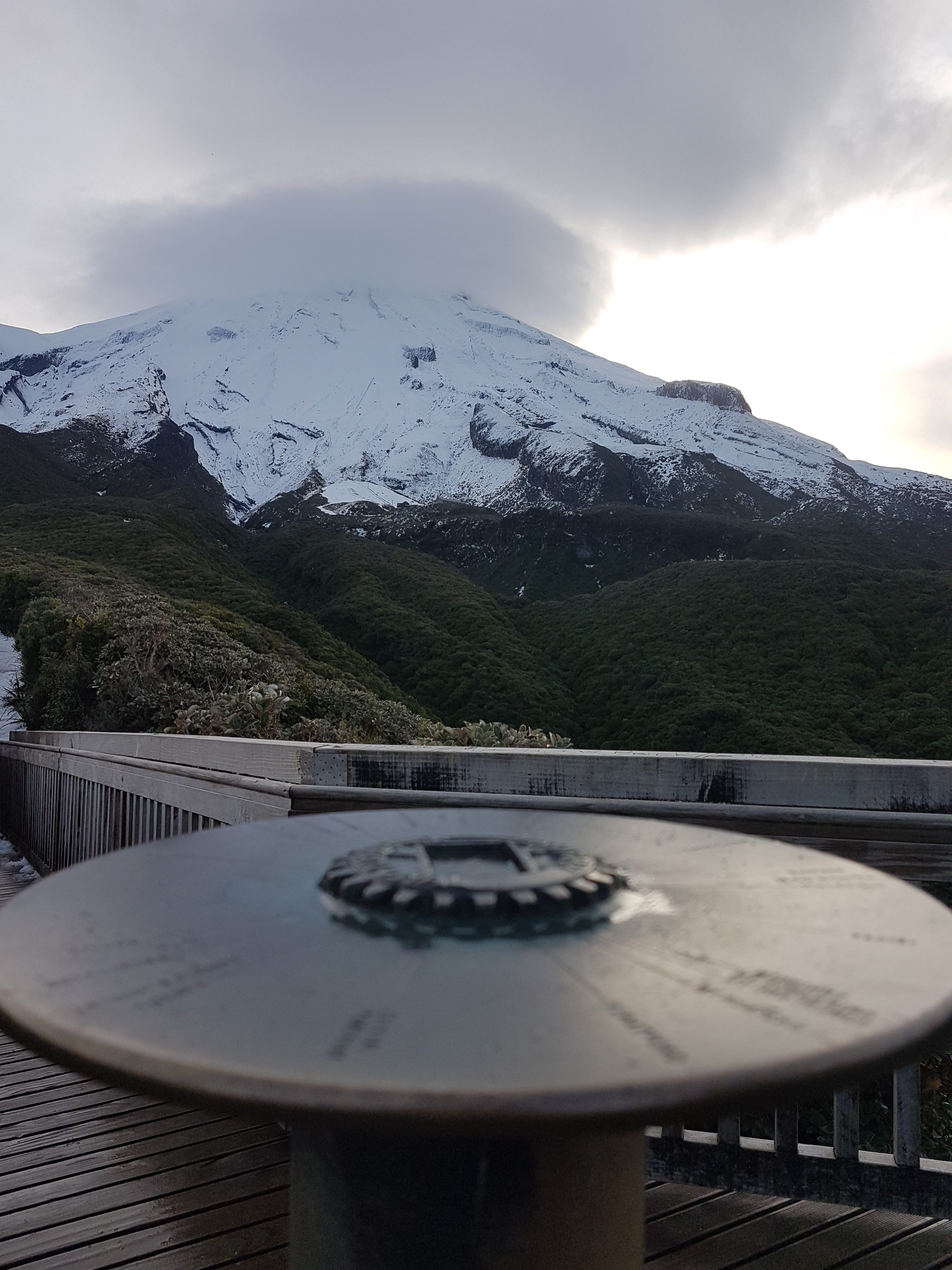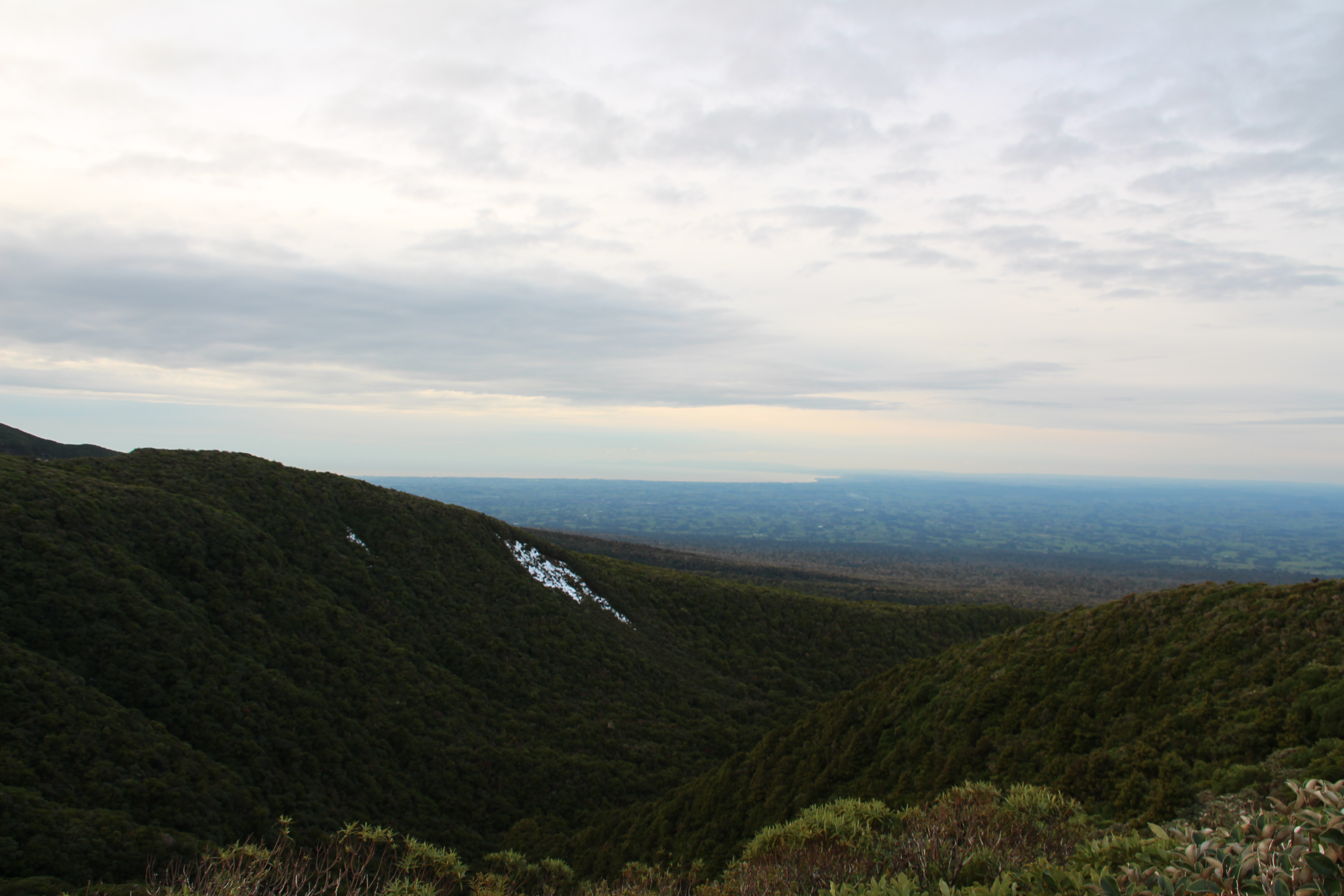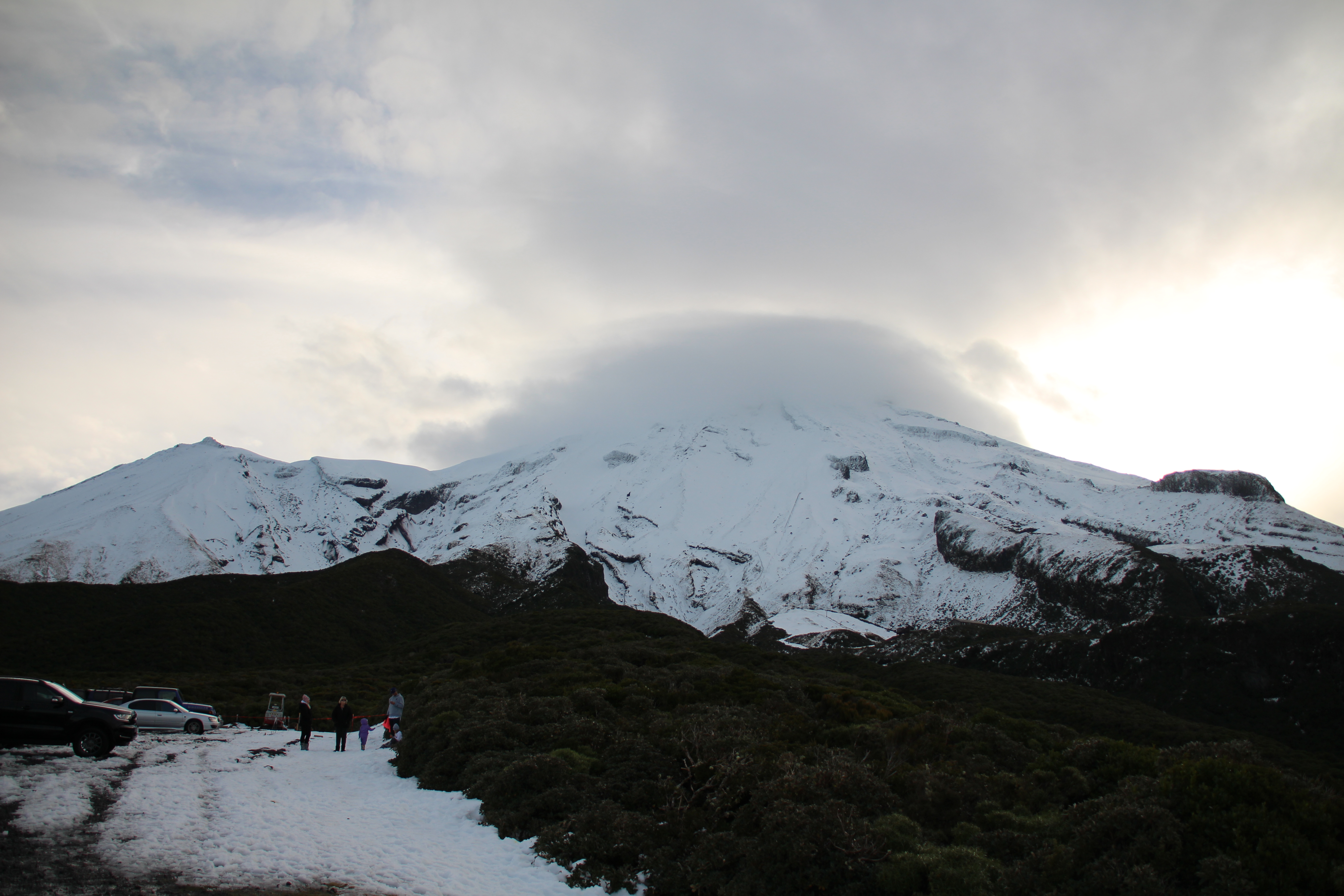 Auf einer kleinen Wanderung versuchten wir doch noch einen Blick auf den „richtigen“ Elefanten zu erhaschen, dies jedoch vergeblich, da der hinter einer weiteren Klippe versteckt war. Auf unserer Wanderung entdeckten wir in weiter Ferne jedoch etwas anderes. Ein mit Schnee bedeckter Berg strahlte uns entgegen. Jetzt gegen Abend hatte sich Mt. Taranaki doch noch entschlossen sich zu zeigen. Also schnell ins Auto und zurück nach New Plymouth. Der Anblick des Berges war herrlich! Zwar hatte es immer noch einige Wolken um den Gipfel, aber mit der Abendsonne und dem leichten Dunst um den Fuss des Berges sah das Ganze wunderschön aus! Um unsere Wanderung noch zu machen, war es natürlich schon viel zu spät, trotzdem versuchten wir noch so nahe wie möglich an Mt. Taranaki heranzufahren. Zu guter Letzt fanden wir uns beim einzigen und extrem kleinen Skiresort des Berges wieder und hatten nicht nur eine tolle Aussicht, sondern auch ein bisschen Schnee und viel kalten Wind um die Nase.