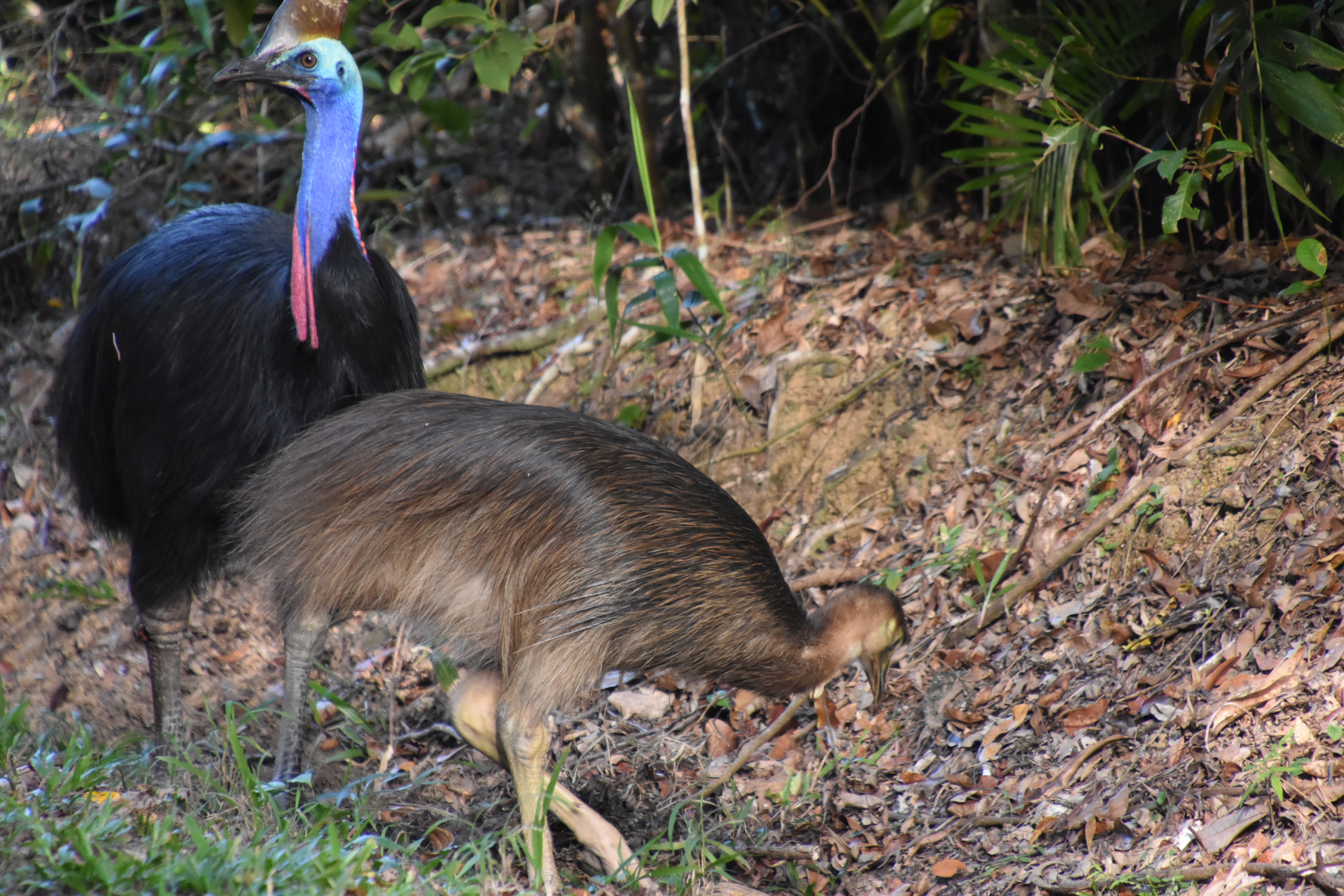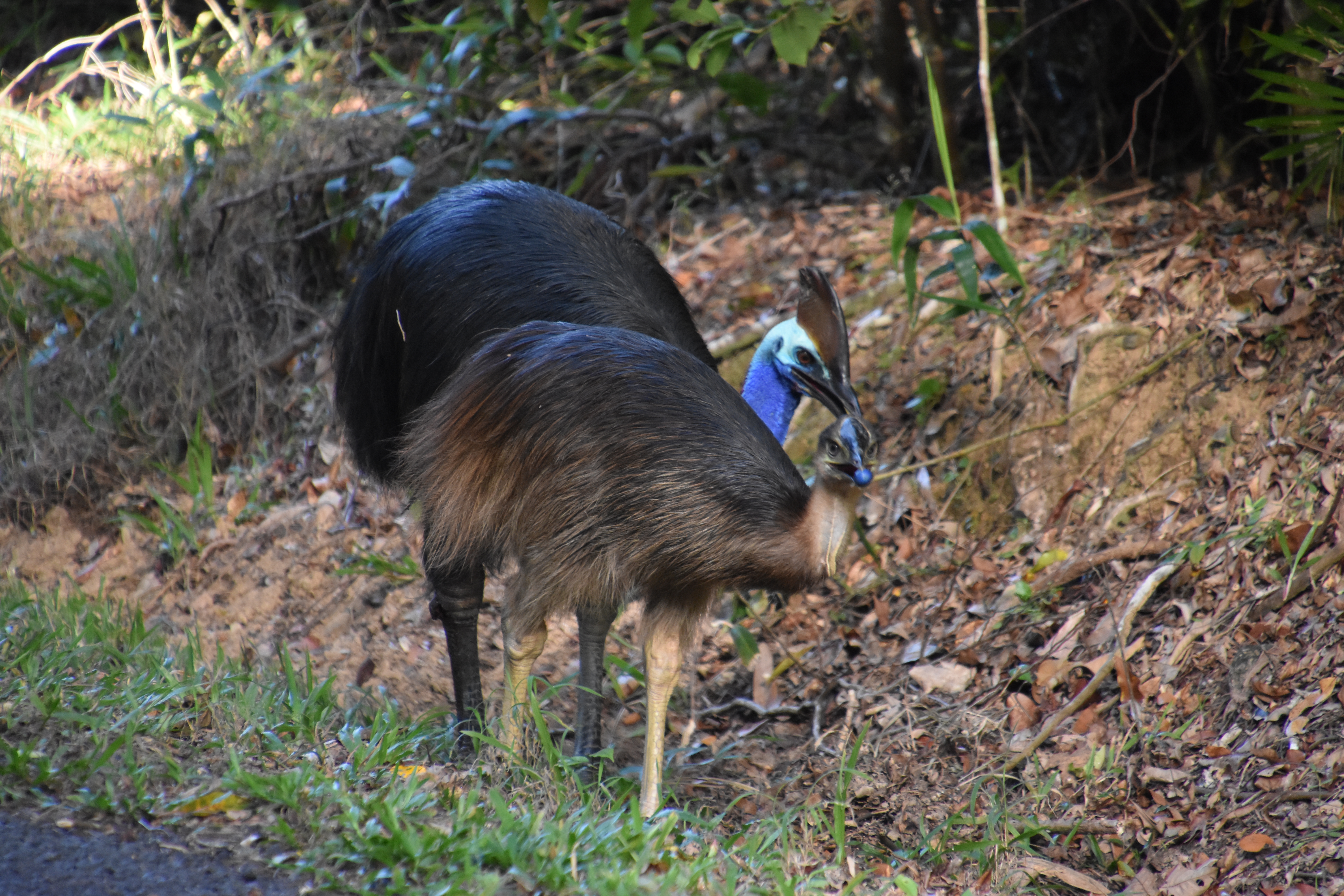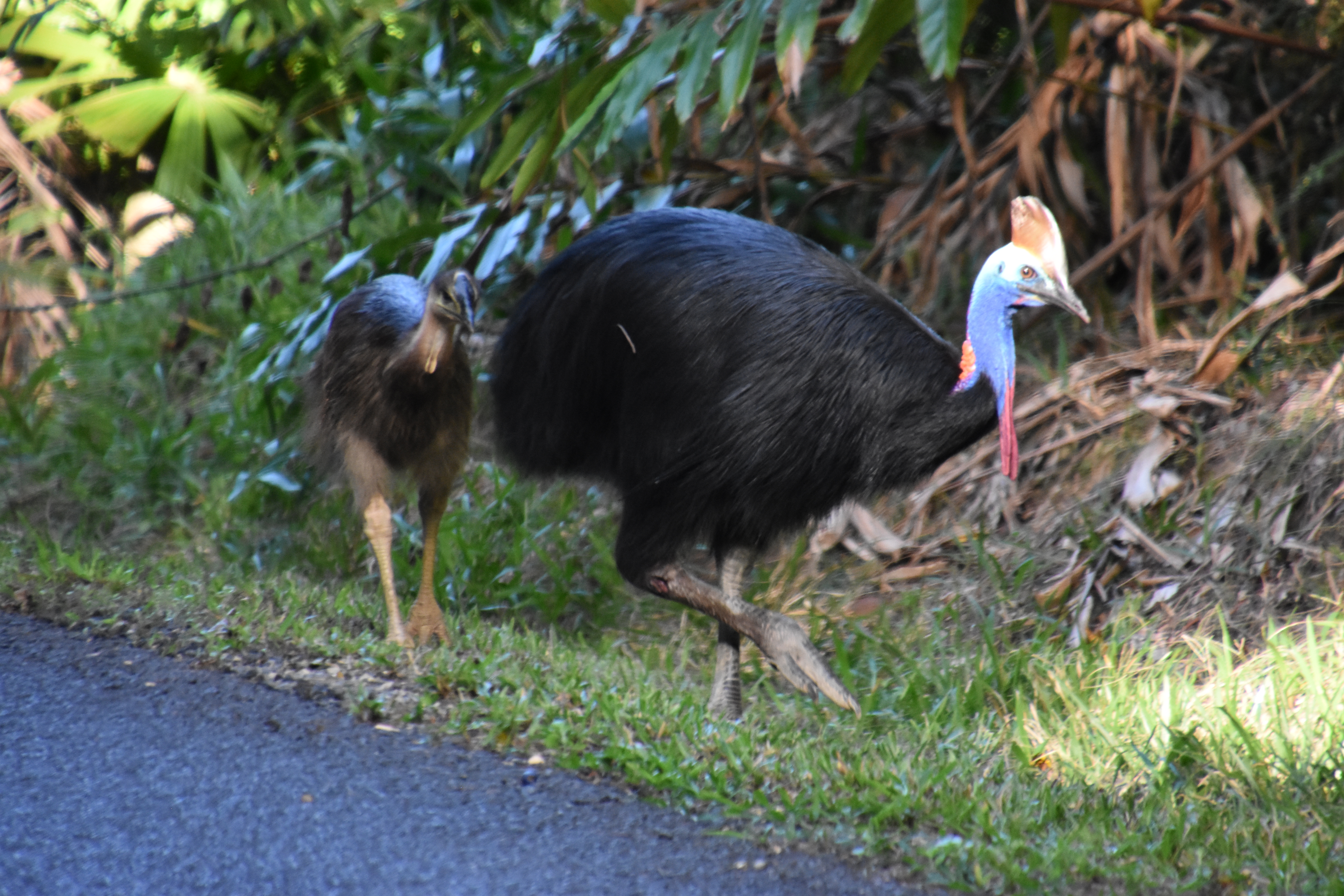 Es war schon Mitte Nachmittag, als wir uns nach einem kurzen Abstecher am Cows Bay Beach auf den Weg nach Norden zum Cape Tribulation machten. Die Strassen im Nationalpark waren schmal und kurvig, doch wir kamen relativ gut voran. Ich hatte Silencio schon den ganzen Tag damit genervt, dass ich unbedingt einen Kasuari sehen wolle, doch die waren, wie wir im Discovery Center gelernt hatten, recht selten. Umso grösser war meine Freude, als der Tourbus vor uns plötzlich stehen blieb und tatsächlich eine Kasuarin mit Jungem über die Strasse lief.