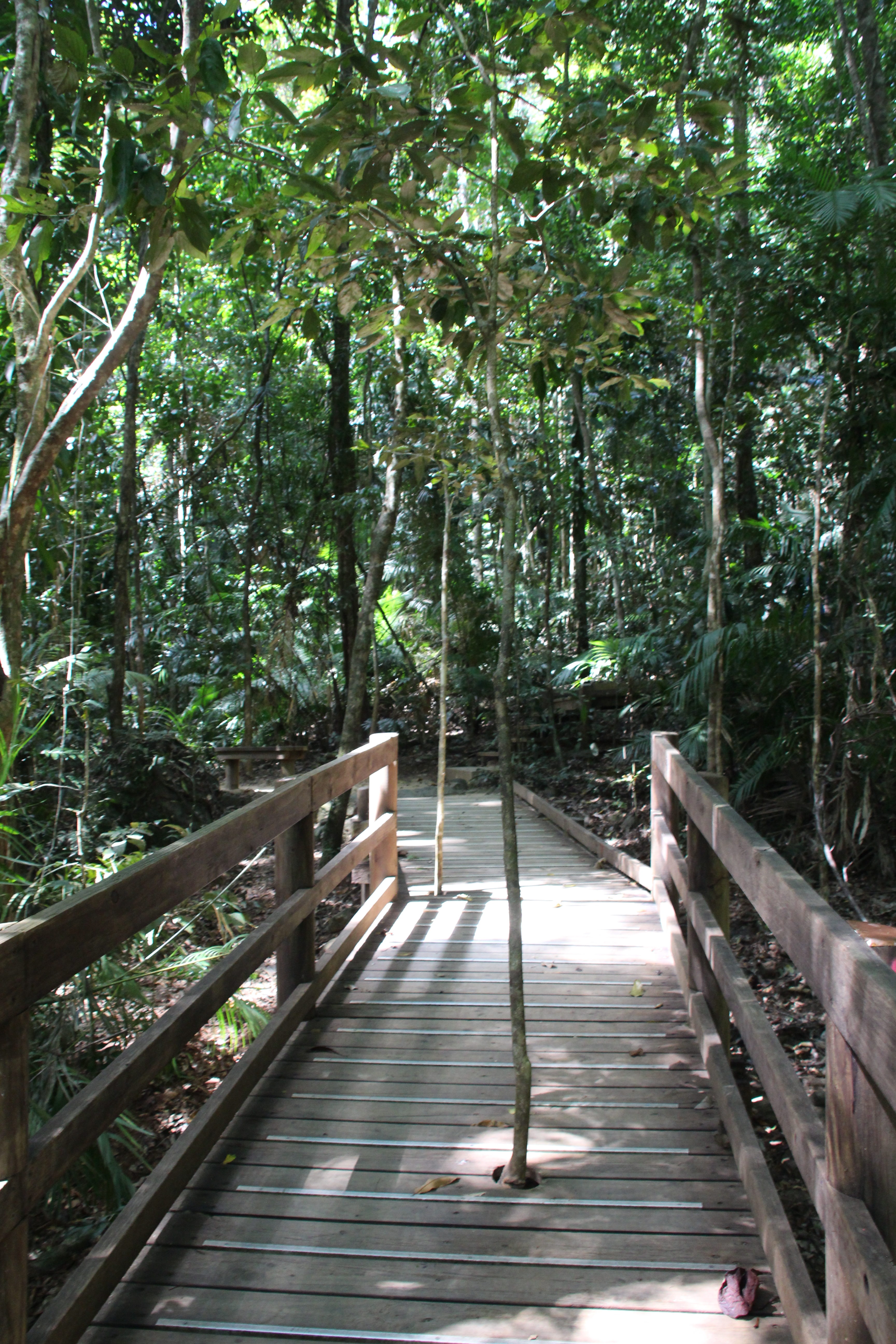 Auf der anderen Seite tauchten wir in den australischen Urwald ein. Wir merkten schnell, dass man im Daintree National Park sehr viel unternehmen konnte, und uns der eine Tag den wir zur Verfügung hatten, wohl kaum ausreichen würde. Als erstes unternahmen wir einen kurzen Boardwalk durch den Regenwald um die neuen Gefilde erst einmal auf uns wirken zu lassen. Ähnlich wie neuseeländischer Bush ist auch der australische Regenwald ziemlich wild und ungezähmt. Tiere sahen wir nicht viele, obwohl wir verschiedenste Vogelarten hörten darunter einen „Hueschti-Vogel“ wie wir den ungesehenen Vogel tauften, da seine Laute mehr wie Husten als wie etwas anderes klangen. Beim Lunch unterhielten wir uns über die Ameisen die auf dem Tisch Patroullie schoben und fragten uns, ob die uns wohl umbringen könnten, denn wie die Neuseeländer mir immer und immer wieder versichert hatten: „Nichts in Neuseeland bringt dich um, alles was dich umbringt ist in Australien“ und so waren wir nun verunsichert, ob das schon bei „harmlosen“ Ameisen anfing. Nach dem Mittagessen besuchten wir das Discovery Center, wo wir vieles über die typischen Tiere des australischen Regenwaldes und ihren Lebensraum näher kennenlernten. Einen „Hueschti-Vogel“ gab es nicht.