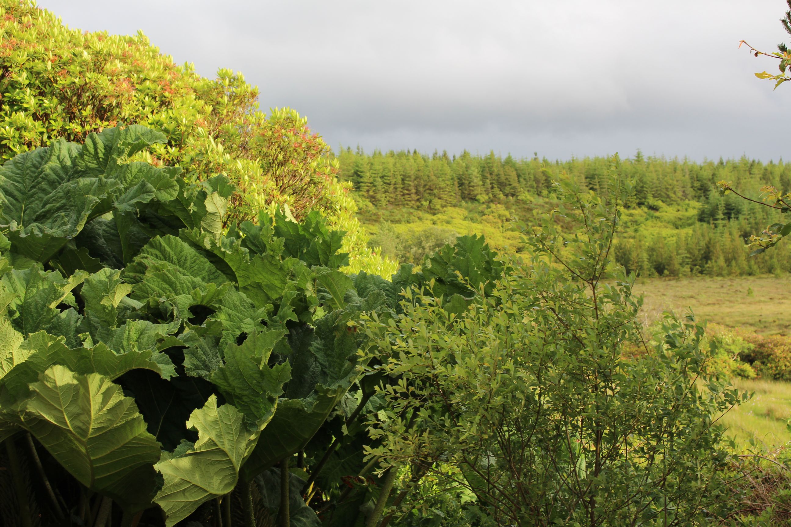 Irgendwann erreichten wir die Kreuzung, an der wir laut Wegbeschreibung des Vermieters links abbiegen mussten. Das führte uns auf eine schmale, ungeteerte Strasse, die zu beiden Seiten von hohen Rhododendronbüschen gesäumt war. Das Grünzeug reichte direkt bis an die Strasse und war so dicht, dass man nicht hindurchschauen konnte. Ca. einen Kilometer ging es in diesen Dschungel hinein. Unterwegs kam man an einer Ruine vorbei. Ein altes Steinhaus, das so von Efeu und anderen Pflanzen eingewachsen war, dass man die Mauern fast nicht mehr erkennen konnte.