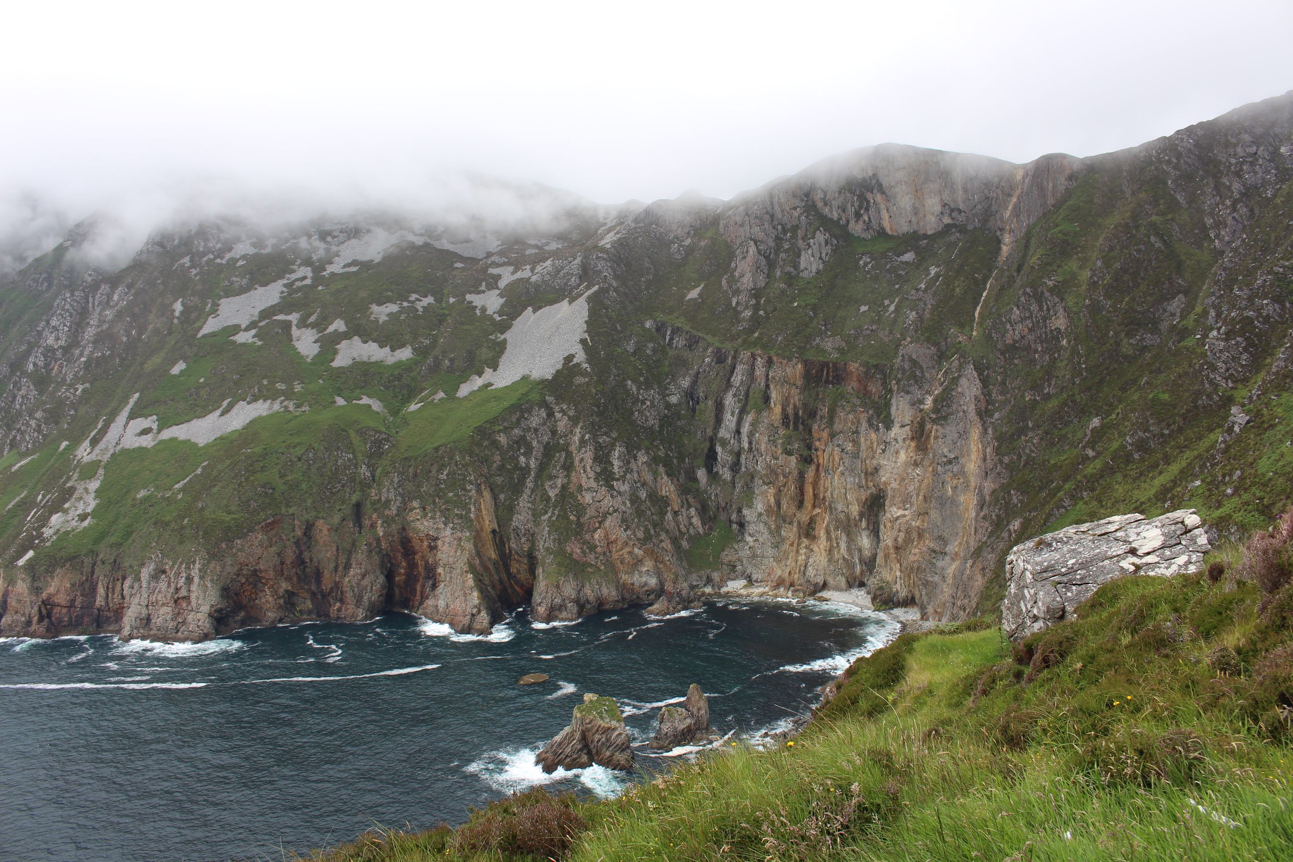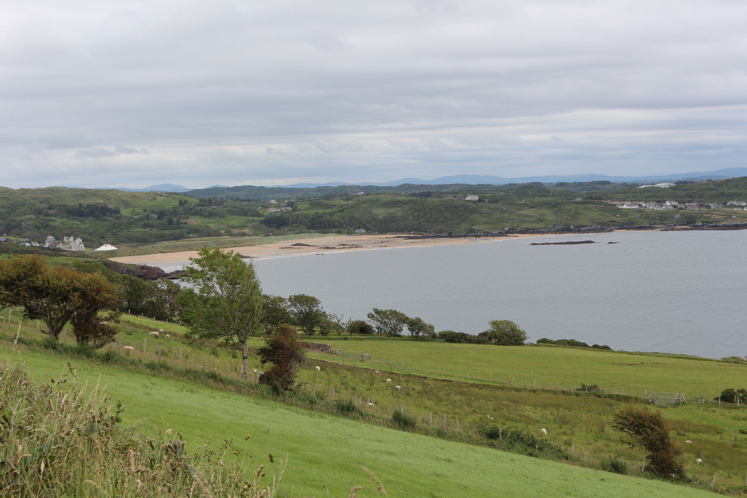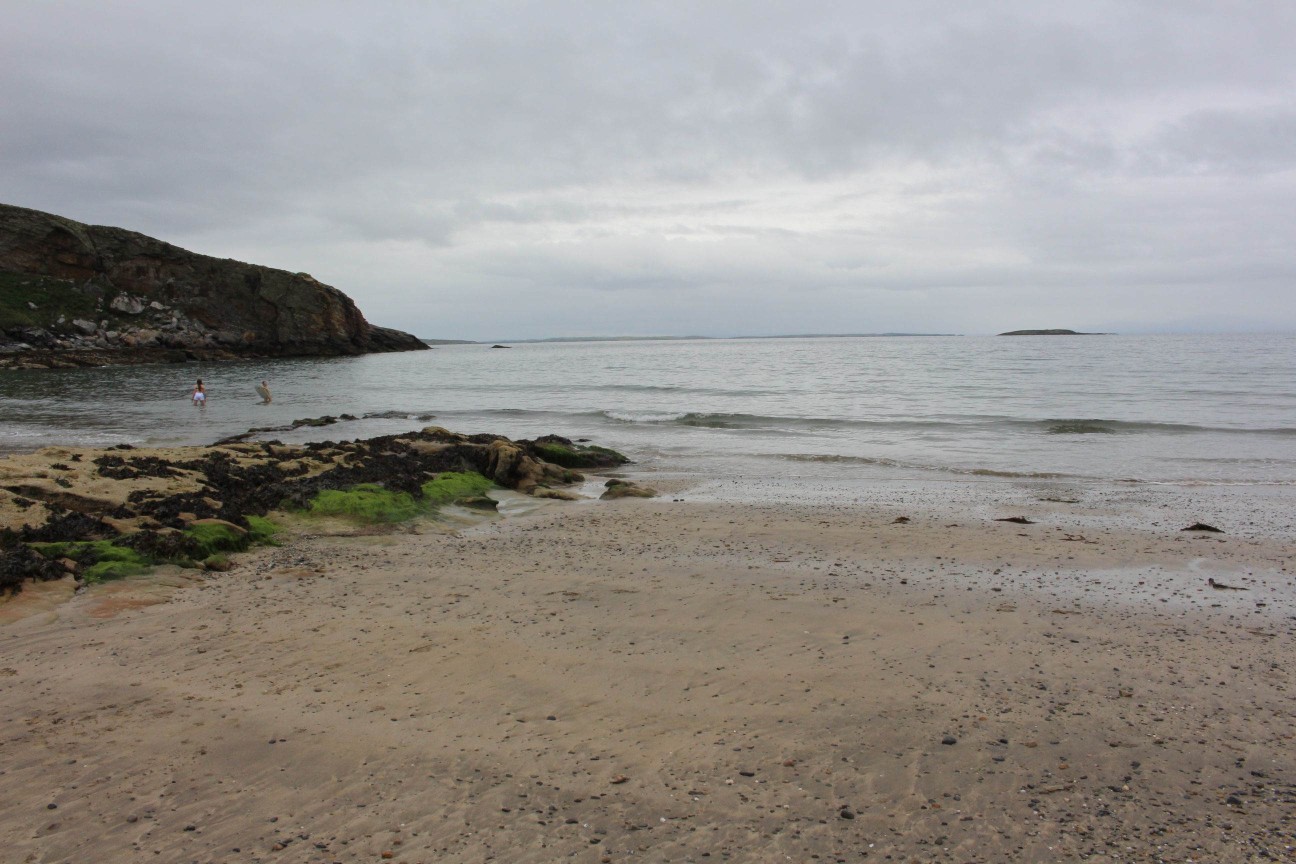 Mit dem Auto fuhren wir zuerst nach Donegal, wo wir in einem Touristenzenter viele Prospekte sammelten, mit Ideen, was man hier noch alles so machen könnte. Anschliessend fuhren wir weiter nach Killybegs, wo wir auf die Küstenstrasse des „Wild Atlantic Ways“ fuhren. Diese Strasse führte mehr oder weniger an der Küste entlang und nach einiger Zeit führte ein Weg tatsächlich hinunter zum Strand. Das liessen wir uns natürlich nicht entgehen, sondern statteten dem Meer einen ersten Besuch ab. Am Strand hatte es auch einige andere Besucher, darunter auch ein paar waagemutige Iren, die sich in Badehose in die Fluten stürzten.