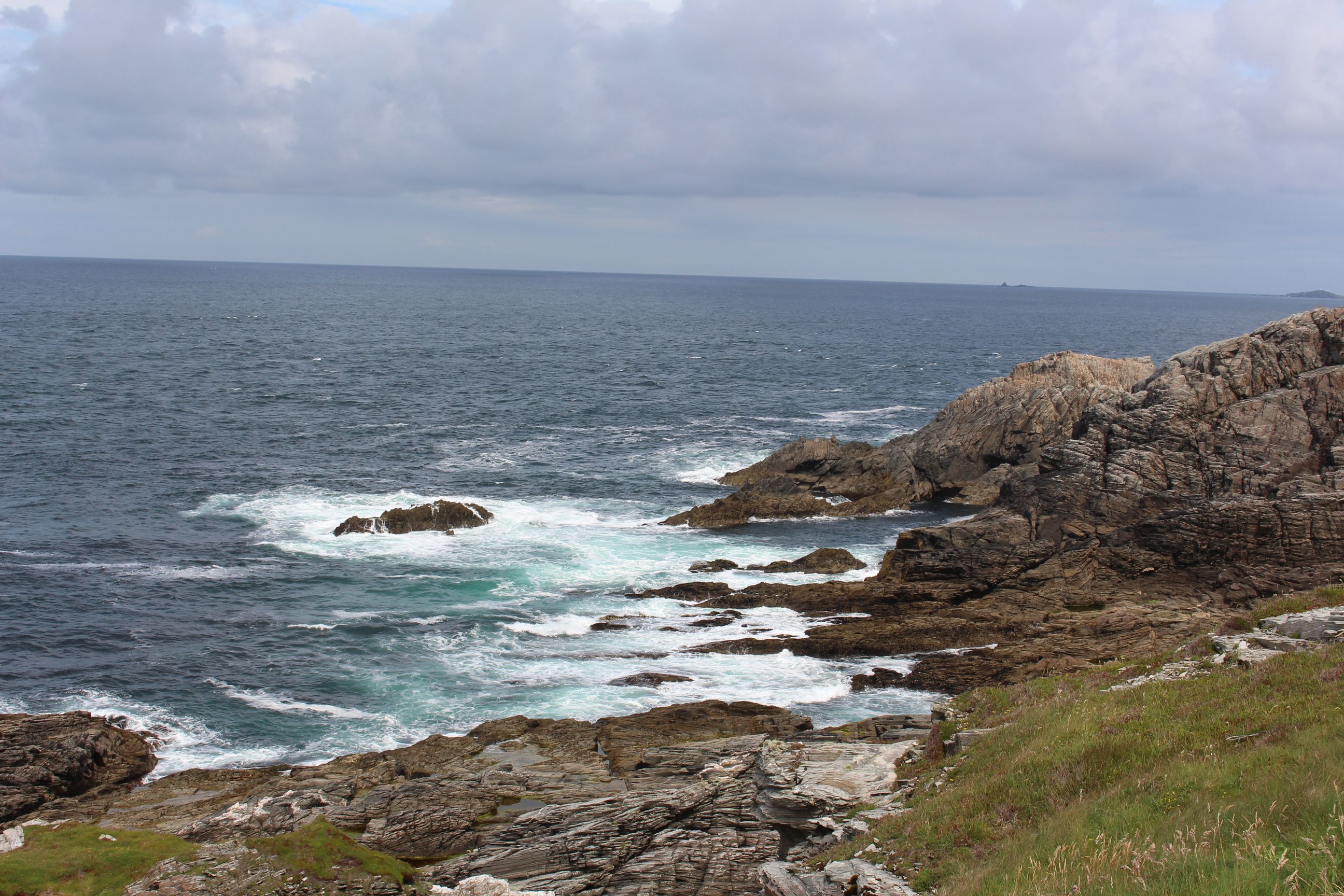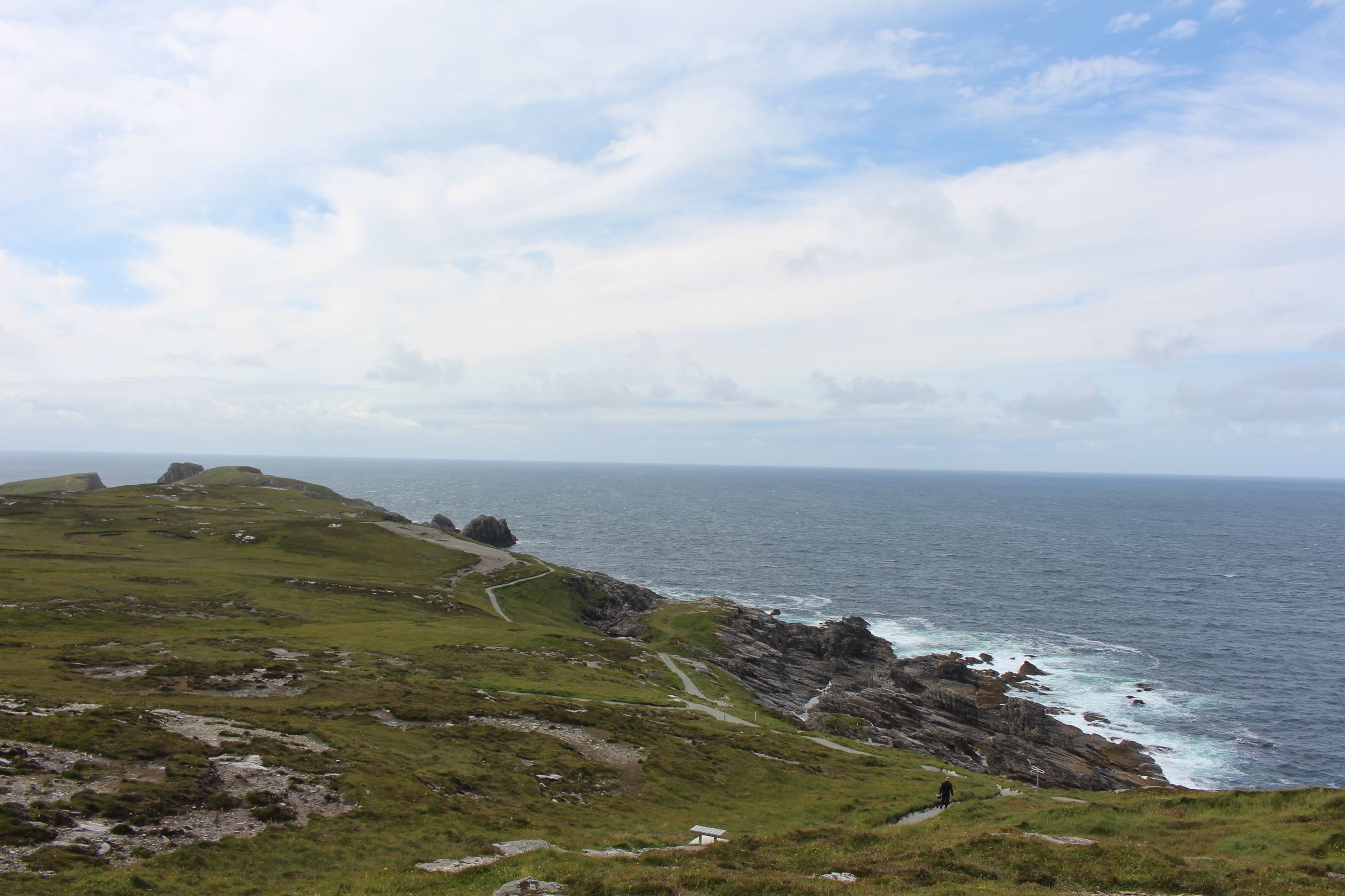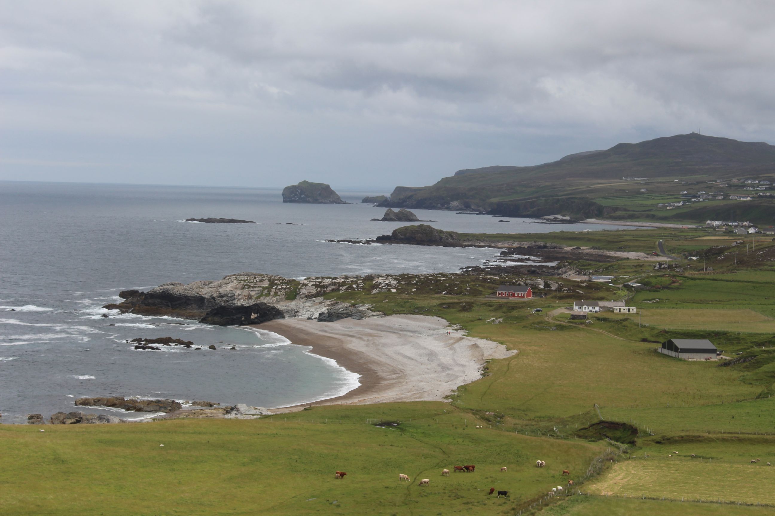 Unser Weg führte uns auf der N13 über Letterkenny nach Fahan, wo wir einen ersten kurzen Stopp einlegten um einen alten Friedhof zu besichtigen. Dort befand sich das Grab von Agnes Elizabeth Jones. Sie war Krankenschwester im 19. Jahrhundert und wurde für ihre gute Arbeit geehrt. Ausserdem befand sich auf dem Friedhof des alten Klosters auch noch eine alte Kreuzplatte die mit kunstvollem Flechtwerk überzogen ist. Nachdem wir den Friedhof besichtigt hatten, ging es weiter Richtung Norden. Wir verliessen die grösseren Strassen und fuhren der Küste entlang. Um zum nördlichsten Punkt zu kommen, mussten wir „The Gap of Mamore“ überqueren. Dies ist ein Pass mit einer sehr steilen Passstrasse (bis 30% Steigung). Eine schnurgerade Strasse führt den Hang hinauf und wenn man den höchsten Punkt erreicht hat, kann man auf der anderen Seite plötzlich den Ozean sehen. Ein Blick zurück erlaubt einem die Aussicht auf einen grossen Windpark, wie man sie hier in Irland oft antrifft.