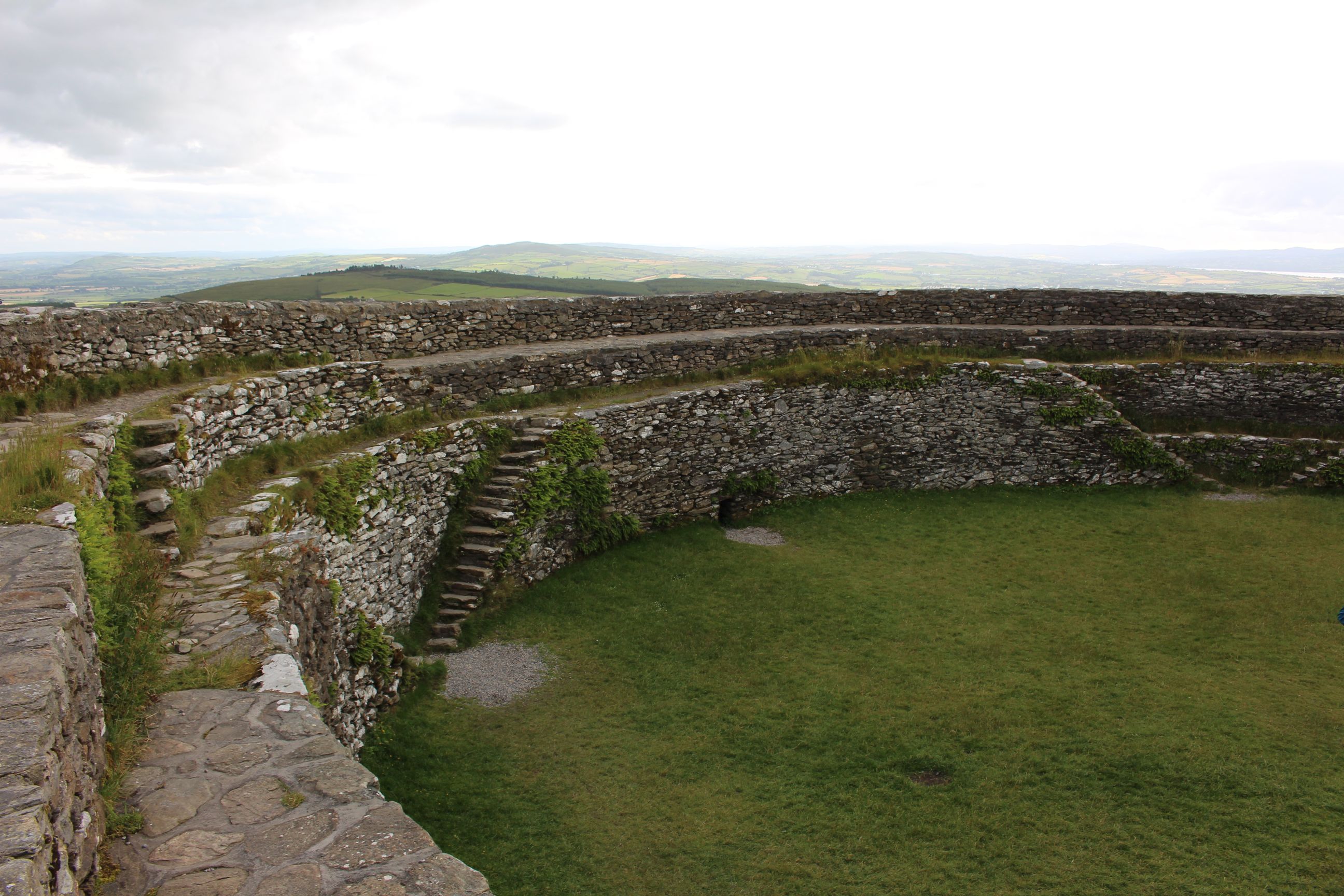 In Burt machten wir noch einmal eine Pause und besichtigten den „Grianán of Aileach“. Das ist ein restauriertes Steinfort, welches ein historisches Zentrum von Kultur und Politik in der Zeit der frühirischen Herrscher (800 v. Chr.) war. Das Fort ist ein rundes Gebilde, das Innen wie ein Amphitheater mit mehreren Sitzebenen aufgebaut ist. Flache Stufen erlauben es einem die obersten Ränge zu erklimmen und von dort oben den fantastischen Blick auf das umliegende Land zu geniessen.