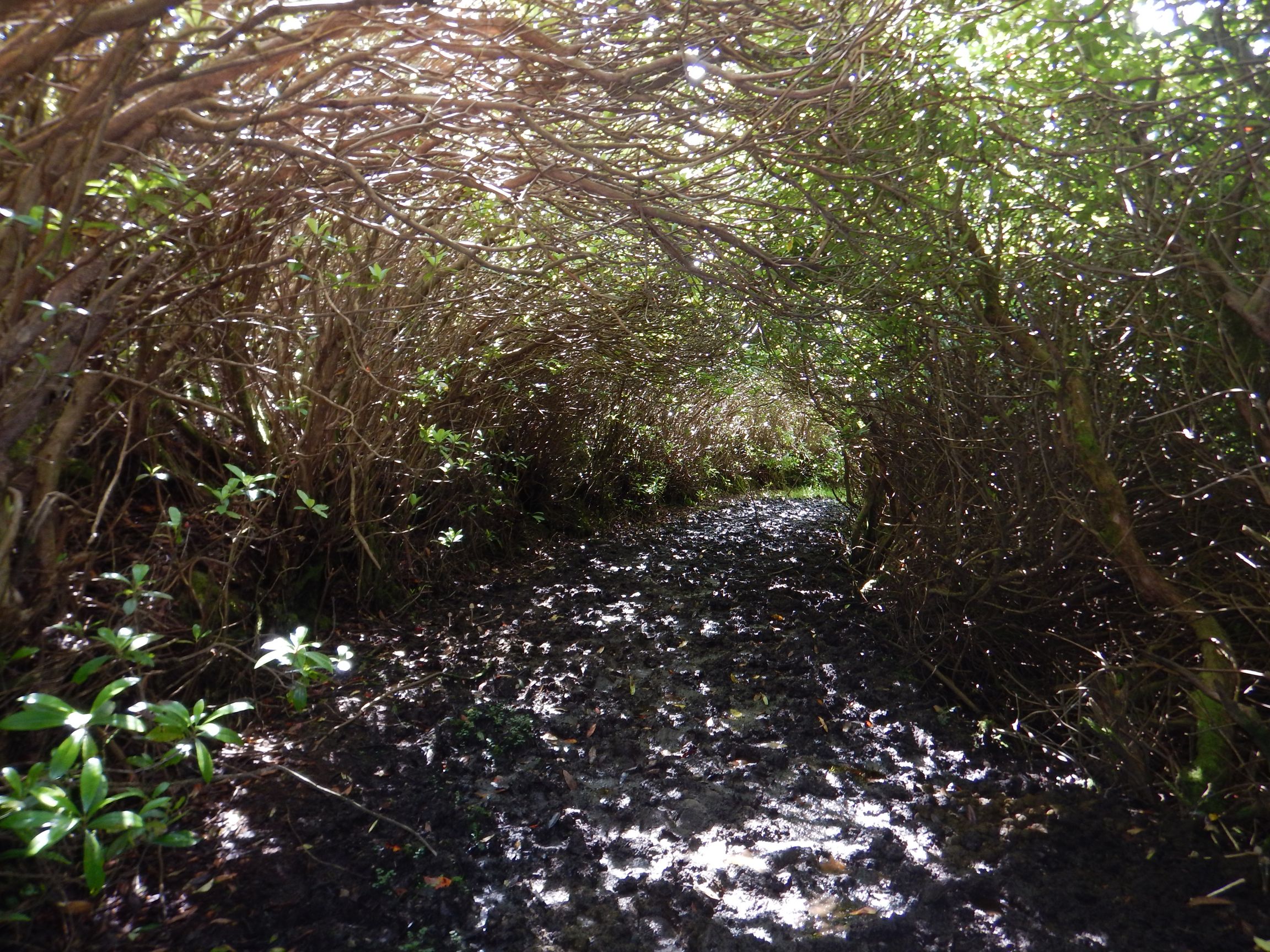 Naja schon die ersten Schritte hinter dem Zaun zeigten, dass wir uns nun auf der Pferdeweide befanden. Tiefe Hufabdrücke und Pferdekot säumten en Pfad, der eigentlich mehr ein Schlammbad war als ein richtiger Weg. Nachdem wir den Trampelpfad auf der Weide wiedergefunden hatten (vom „ruhigen Pferd fehlte jede Spur“) folgten wir dem Matsch zwischen Rhododendron hindurch bis zu besagter Moorlandschaft. Nun zeigte sich schon überdeutlich, dass Gummistiefel wirklich unabdingbar waren, mit normalen Schuhen, hätten wir das nämlich nicht geschafft. Immer wieder versank man im Morast und man musste aufpassen, dass die Stiefel beim Herausziehen nicht stecken blieben.