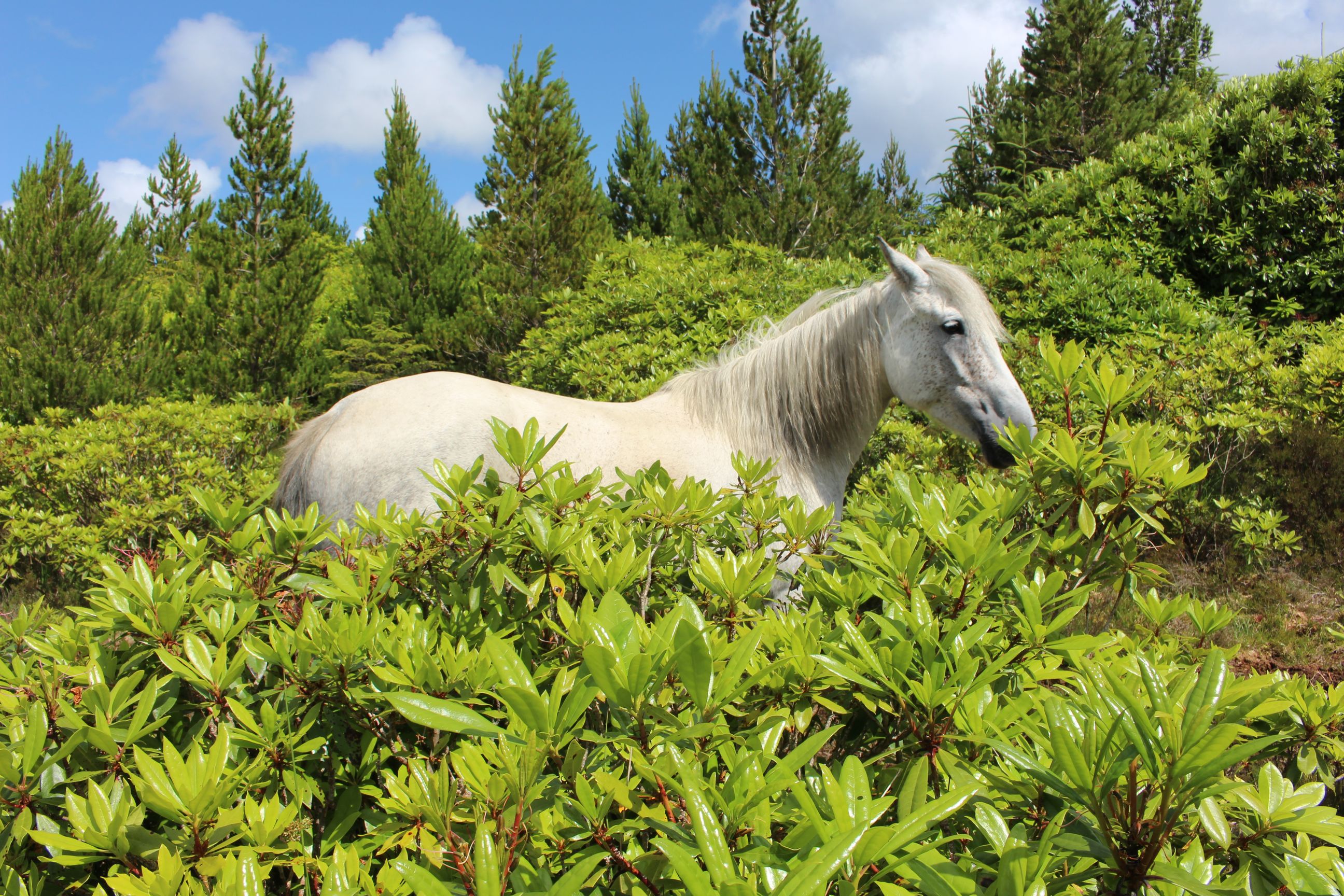 Beim Zurücklaufen durch das Moor blieb Fabian plötzlich stehen und deutete nach vorne. Wir hatten an diversen Stellen schon Pferdedung gesehen, doch niemand hatte damit gerechnet, dass das Pferd uns bis hierhin folgen würde. Doch dort zwischen einigen Büschen stand es und graste. Leider stand es genau neben dem Trampelpfad und da wir das Pferd nur von der Beschreibung her kannten, wollten wir ihm nicht zu nahe kommen.
